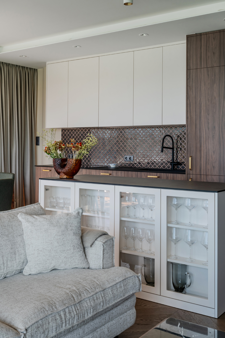 Apartament, w którym malownicza sceneria przenika do wnętrza, tworząc atmosferę luksusowego wypoczynku.